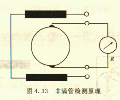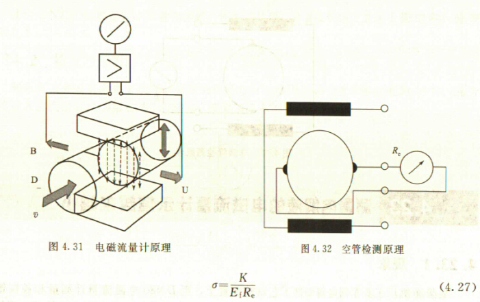 非滿管(guǎn)檢測也是基于電(dian)導率檢側的方法(fa)。在圖4.33所示的電磁(cí)流量傳感器中,增(zēng)加了一個(或一對(dui))非滿管檢測電極(ji)。當導管内液🈚體滿(man)管時,頂部電極與(yǔ)其他電 極🔞之間的(de)👉電阻值很小;而當(dāng)存在非滿管情況(kuang)⛱️時,頂部電極與導(dao)電液體之間有氣(qi)體阻🤩隔,所以電♉極(ji)電阻顯著增大,從(cóng)而做出非滿管判(pan)斷。